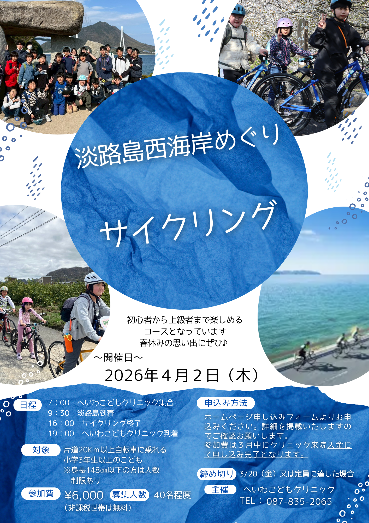 2026年4月 淡路島西海岸めぐりサイクリングの御案内 2026.02.26 淡路島西海岸めぐりサイクリング(PDF) ※撮影した写真が当院のホームページに掲載されることがあります。 ※閲覧用のパスワードは当日お知らせします。 淡路島西海岸めぐりサイクリングの参加申し込みフォーム